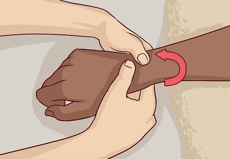 ۲. مچ را ماساژ دهید. کف دست را به‌سمت پایین بگیرید. با شست‌هایتان فشار وارد کنید و دایره‌های کوچک در اطراف استخوان‌های مچ بسازید. هنگام کار، مچ را به بالا و پایین حرکت دهید. در قدم بعدی، مچ را به بالا برگردانید و داخل مچ را با شست‌هایتان نوازش کنید. یکنواخت فشار وارد کنید و روی کف دست و به‌عقب به‌سمت مچ، دست بکشید.